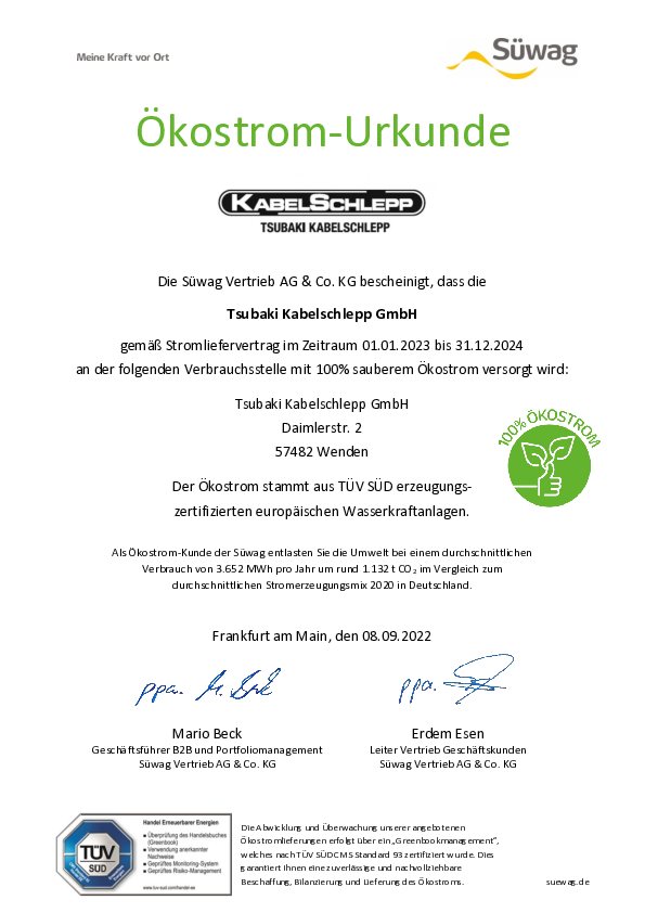 As of 1/1/2022, Kabelschlepp changed its electricity supply from gray electricity to 100 % green electricity, reducing a large emissions factor from over 1,000,000 kg CO2℮ to 0 kg CO2℮.