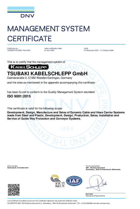 Since 1997 we have a quality management in operation system in compliance with DIN EN ISO 9001 and certified by an independent body. In addition a wide selection of the product ranges of the TSUBAKI KABELSCHLEPP cable carrier systems are subjected to design testing by the TÜV Rheinland in accordance with 2PFG 1036 / 10/97 at regular intervals.
