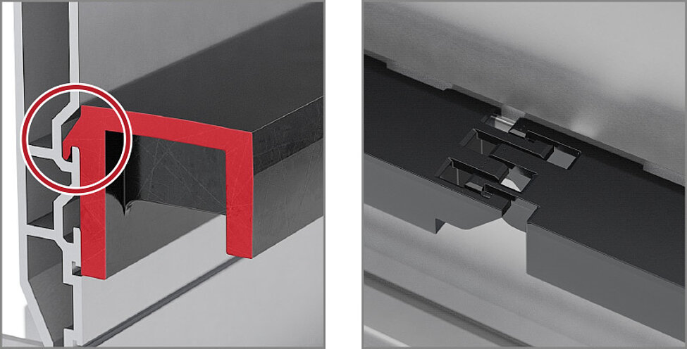 The internal or external mounting kits made of stainless steel are mounted at the joints, ensuring precise connection of the joints in addition to fastening the channel to the substructure.