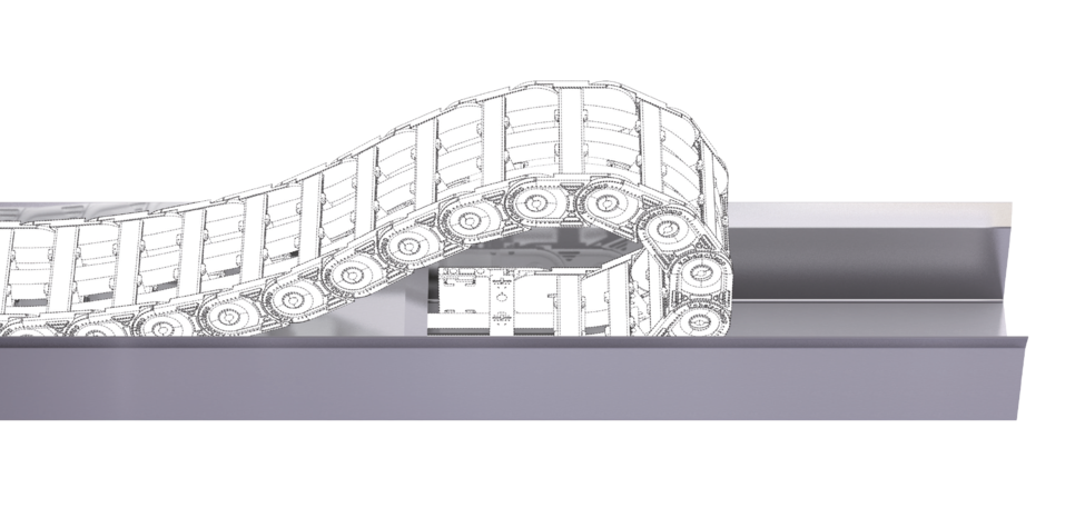 For one-sided arrangement of the cable carrier, the cable carrier slides behind the fixed point on a continuous slide support with run-on bevels.