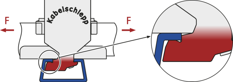 In practical operation, tensile forces occur in both cable directions. Clamps therefore have to transmit high tensile forces in the respective direction. In contrast to standard commercial clamps, the LineFix® foot geometry ensures transmission of extremely high tensile forces equally in both directions. The catch fixes the foot securely in the C-profile when it is bolted on, preventing the crossbar from tipping out during load application, regardless of the direction of forces or installation.