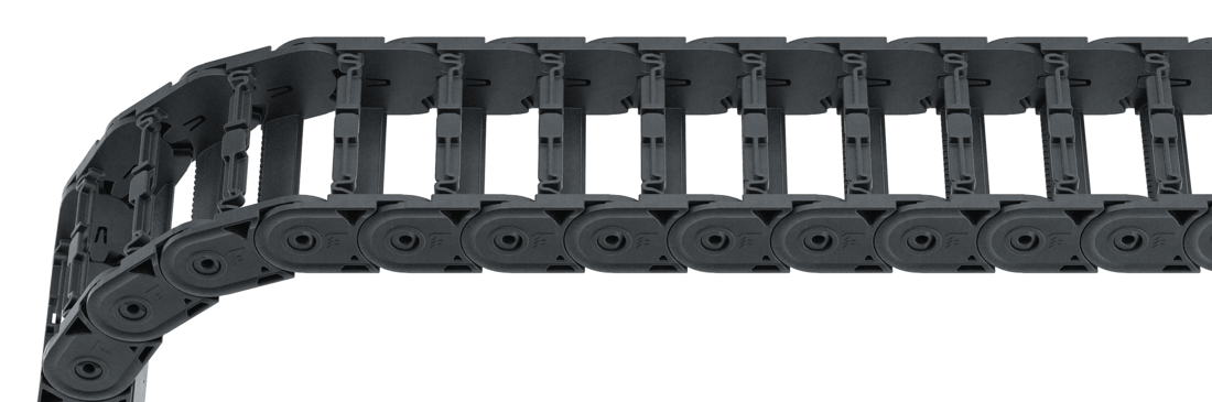 For applications with lateral accelerations and applications with the cable carrier rotated by 90°, the dividers can easily be fixed on the stay through rotation. The arresting cams snap into the catch profiles in the covers (version B).