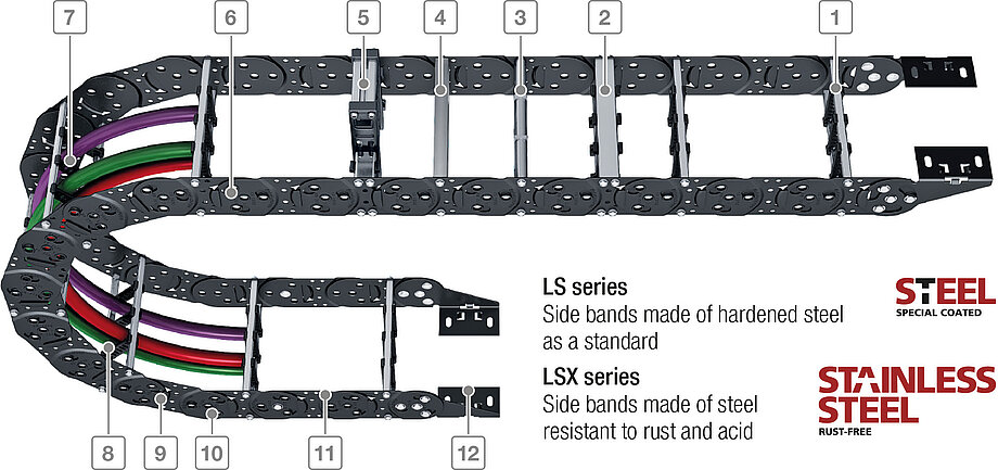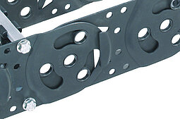 The weight-optimized link plate design makes the cable carriers very light yet highly sturdy. For the LS series, the unsupported length is significantly higher compared to plastic cable carriers of a similar size.
