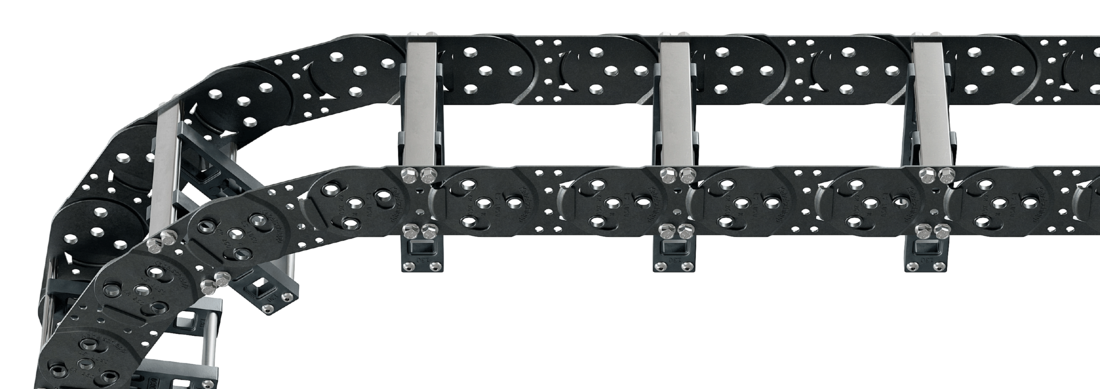 Aluminum profile bars with plastic mounting frame stays for guiding very large cable diameters.