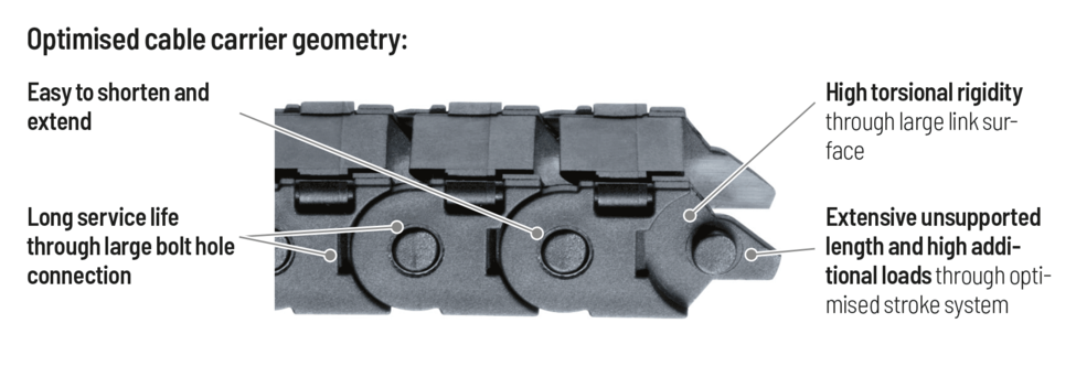 Sagging of the cable carrier is technically permitted for extended travel lengths, depending on the specific application.