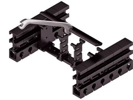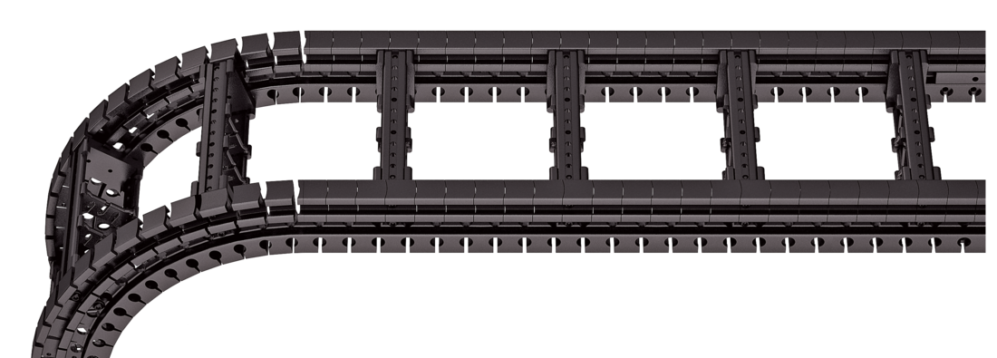 For applications with lateral accelerations and applications with the cable carrier rotated by 90°, the dividers can easily be fixed by turning the frame stay by 180°. The arresting cams click into place in the locking grids in the crossbar (version B). The groove in the frame stay faces outwards.