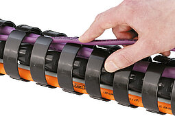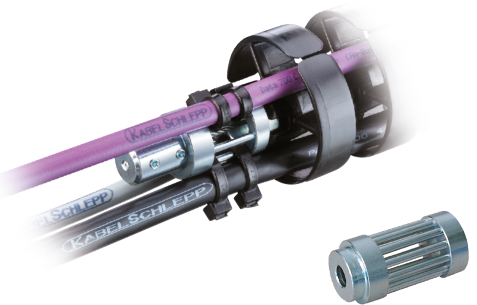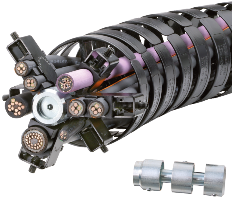 Protectors ensure that the bending radius does not fall below the minimum in any direction. The links can be rotated in the radial direction (see table values). The cables can be separated in three chambers.