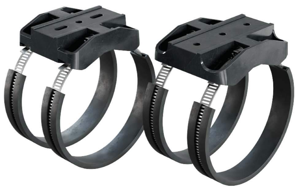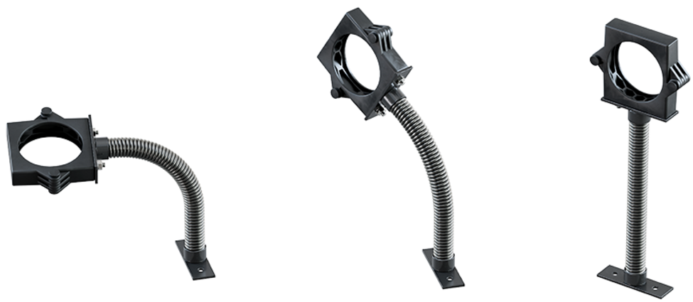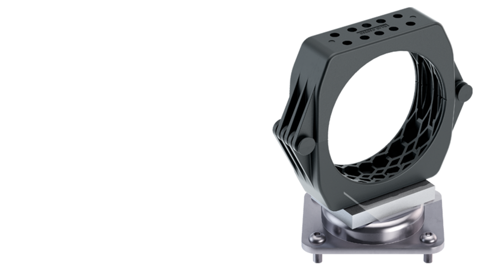 The ROBOTRAX® cobot holder was specially developed for sizes R040 and R056 as well as for corrugated tubes from the FIPLOCK® series (23-48). As a high-quality solution for industrial use, the sturdy steel straps offer non-slip support up to 100 N centrifugal force and thus ensure the trouble-free function of the cobot and the attached cables and hoses in continuous operation. It can be mounted on various surfaces and on diameters between 50-130 mm. The anti-twist design, an easily accessible lock and a protective rubber profile provide additional safety and support.