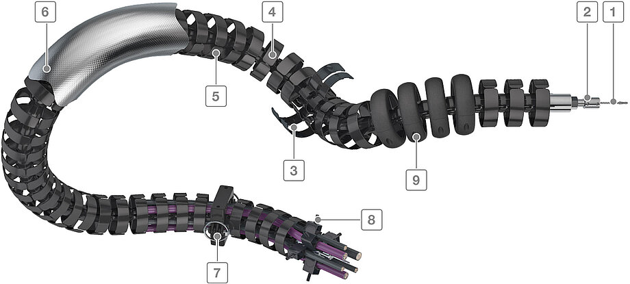 - Protection against hard impacts, excessive abrasion and premature wear as well as limitation of the bending radius through protector