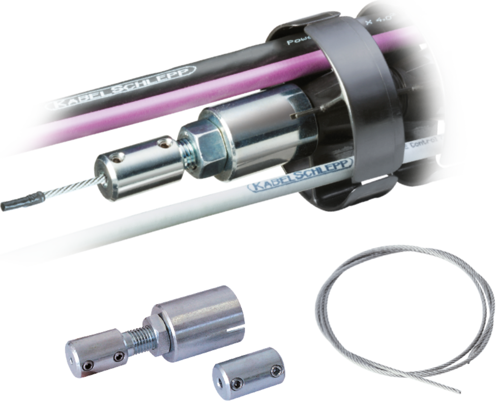 The mounting set consists of steel cable, clamping and tension piece for up to 5 m cable carrier length.