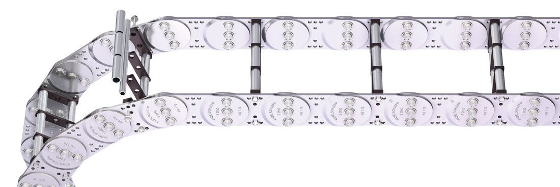 - Steel rolling stays with gentle cable support and plastic dividers. Ideal for using media hoses with soft sheathing. Easy screw connection.