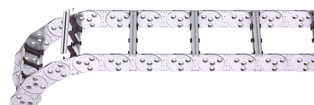 - Aluminum profile bars for heavy loads and maximum cable carrier widths. Double threaded joint on both sides “Heavy Duty”.