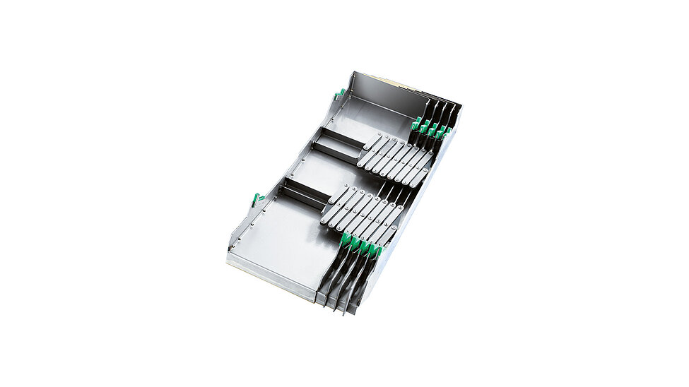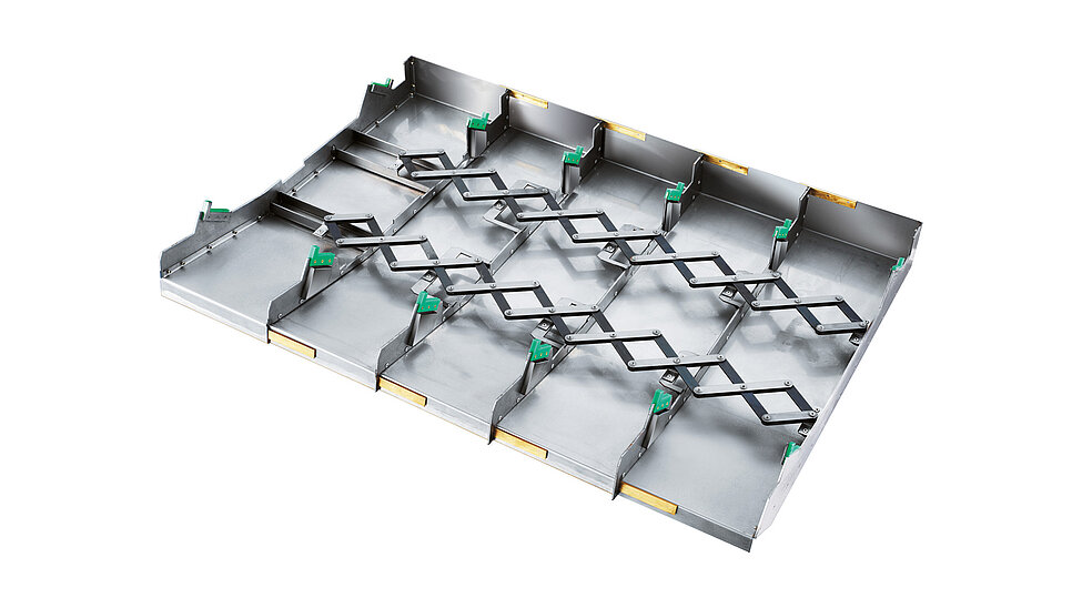 Modern 5-Axis portal milling machines efficiently produce high-precision workpieces. The process speed generated of up to 30 m/min. and more place high demands on the telescopic covers installed to protect the guideway. The proven synchronizer (harnesses) provide uniform movement of all boxes and ensure a collision-free process. Disruptive impact pulses are reliably prevented.